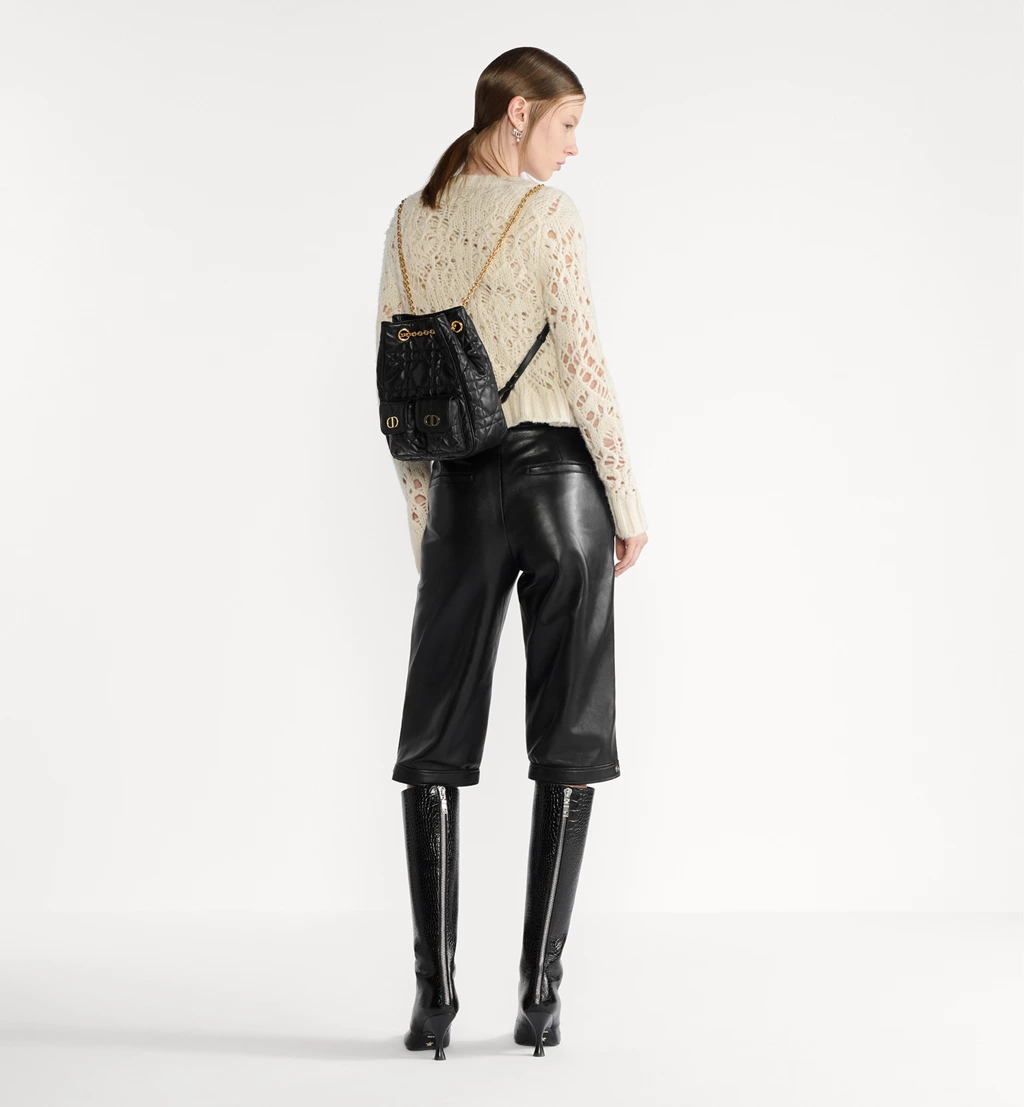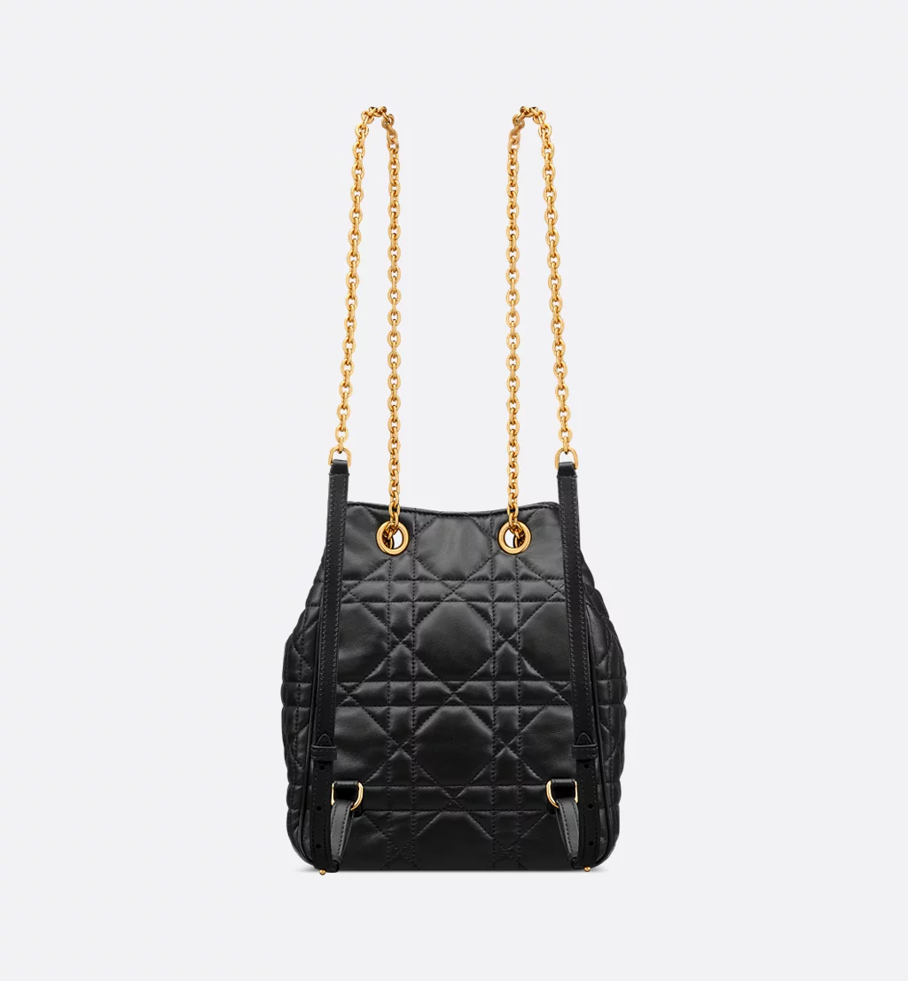 New to the Fall/Winter 2025 ready-to-wear collection, the Dior Caro Multicarry backpack embodies chic elegance. Crafted from black lambskin leather with oversized cannage topstitching, it offers a versatile style and a simple, eye-catching silhouette. It features a spacious main compartment with a magnetic closure, and two small front flap pockets embellished with a gold-finish metal CD logo for added sophistication. The medium size features a sliding chain and leather strap, allowing it to be comfortably carried on both shoulders or with the dual chain straps.