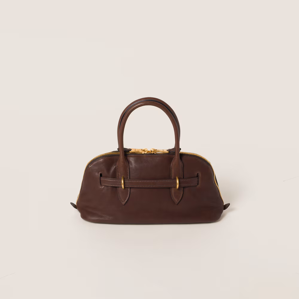 This Aventure Nappa leather tote bag draws inspiration from Miu Miu's heritage pieces. Its structure has been redesigned for greater lightness and a fresh personality, resulting in a timeless classic. Embossed monogram adds a touch of brand recognition.