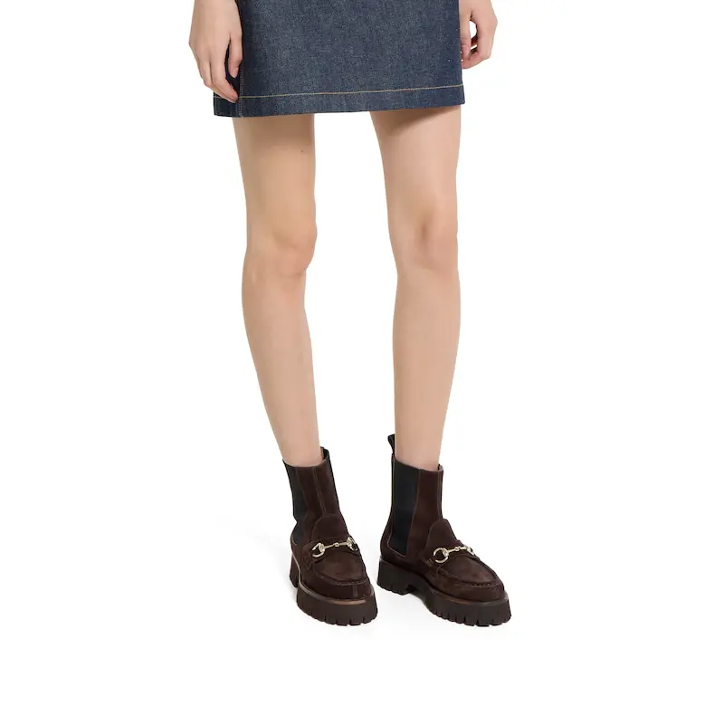 Embellished with Gucci's signature horsebit detail, these ankle boots pay homage to the brand's equestrian roots. Crafted from smooth suede, they're enhanced with light gold hardware.