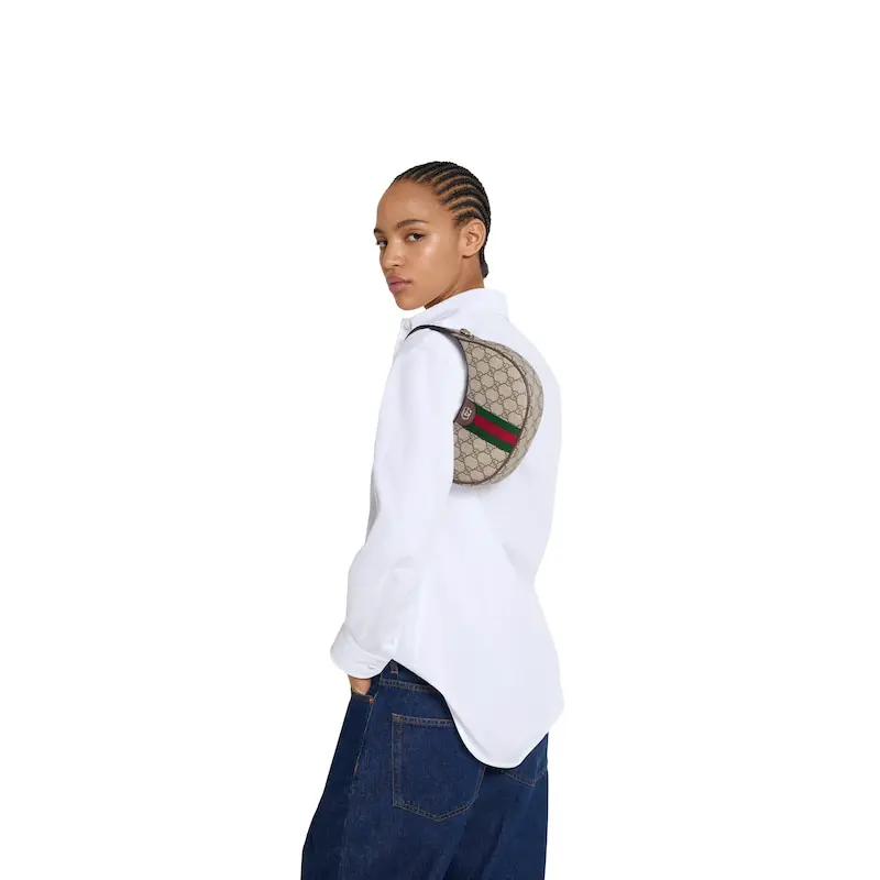 The Ophidia collection showcases innovative shapes and functionality in signature beige and brown colorways, resulting in soft, modern bags. This crescent-shaped shoulder bag features an elegant chain strap.