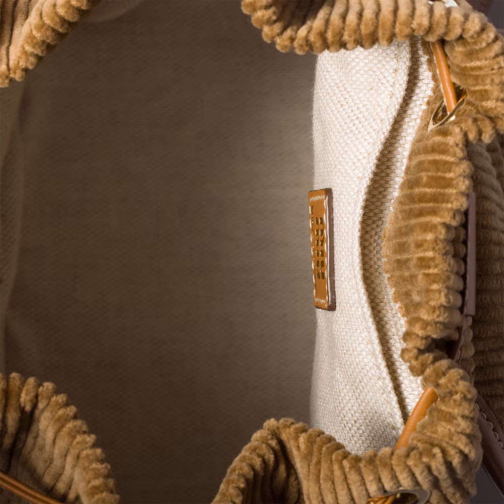 Vintage elements and elegant modern functionality define the style of this Miu Miu backpack, featuring a multi-pocket design, leather trim, and a refined corduroy texture.