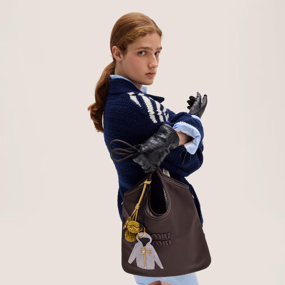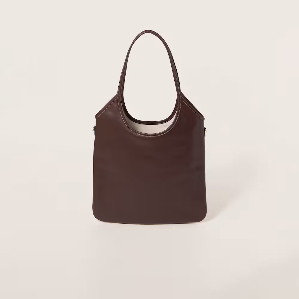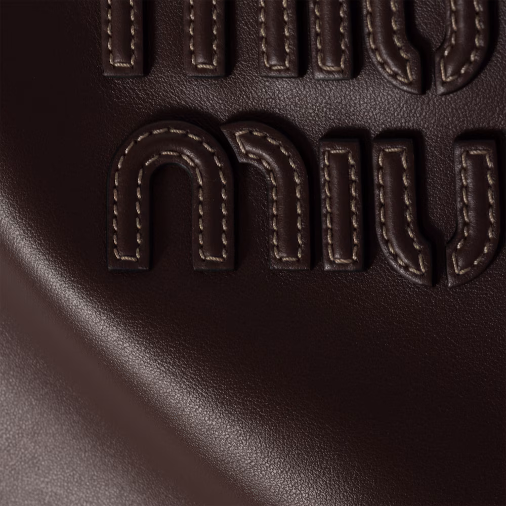 This classic IVY tote bag features metal details and the Miu Miu monogram logo, showcasing its timeless style and making it highly recognizable.