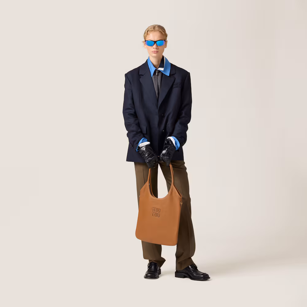 This classic IVY tote bag features metal details and the Miu Miu monogram logo, showcasing its timeless style and making it highly recognizable.