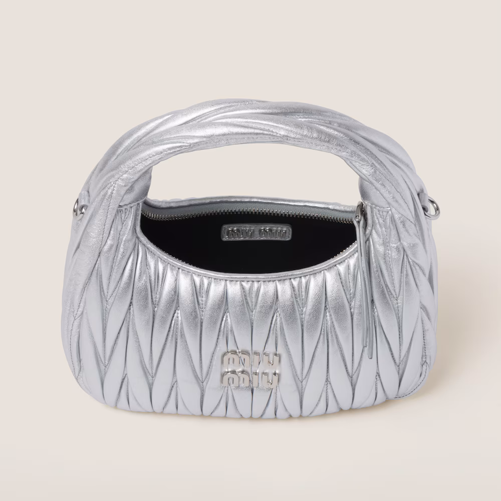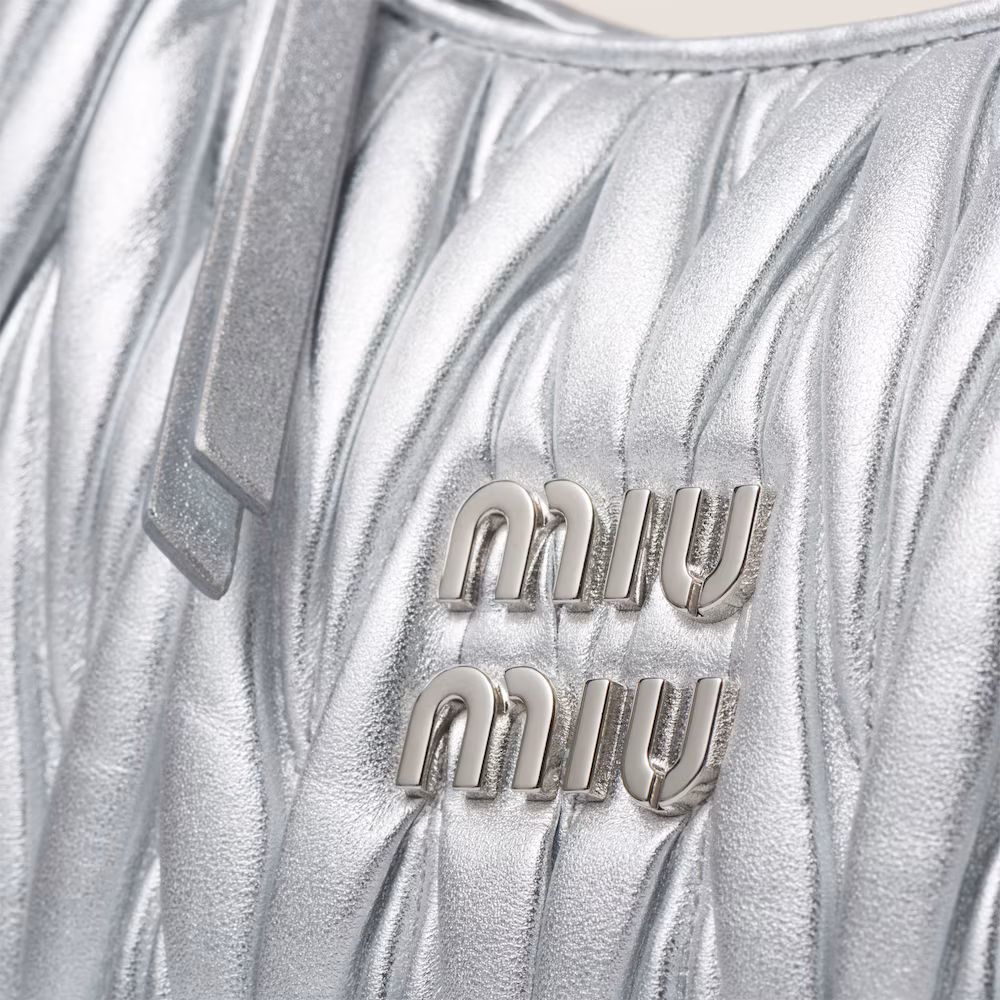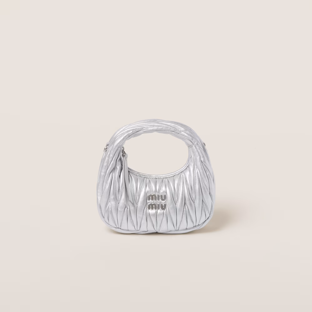 Miu Miu bags: Wander Matelassé mini Hobo bag in soft lambskin leather, small crescent bag.