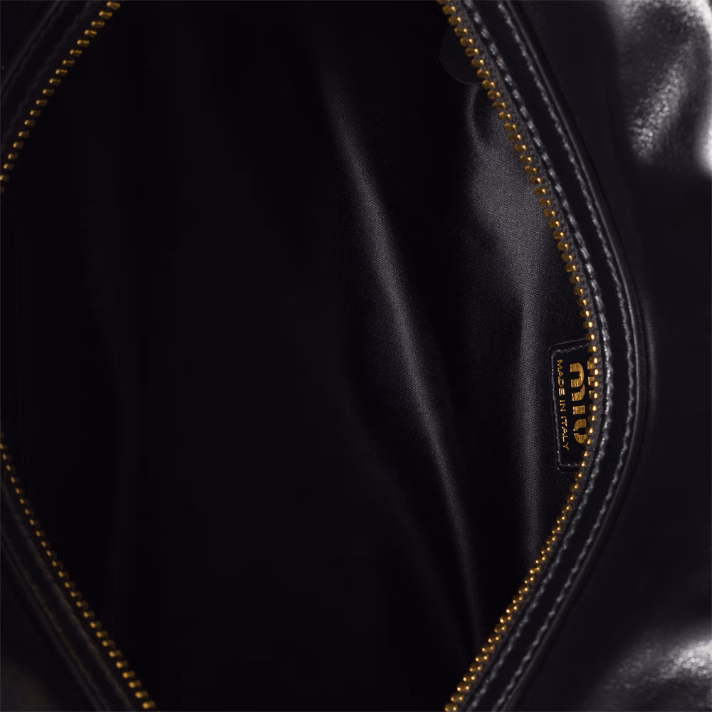 Compact and versatile, this new interpretation of the tote bag features flat handles, an elegant logo on the front, and the subtle sheen of supple calfskin, embodying Miu Miu's refined experimental spirit.