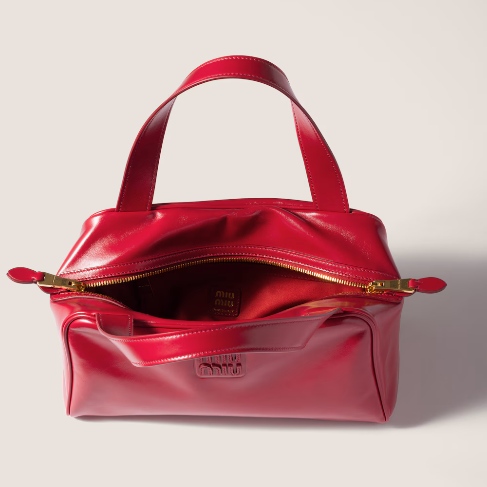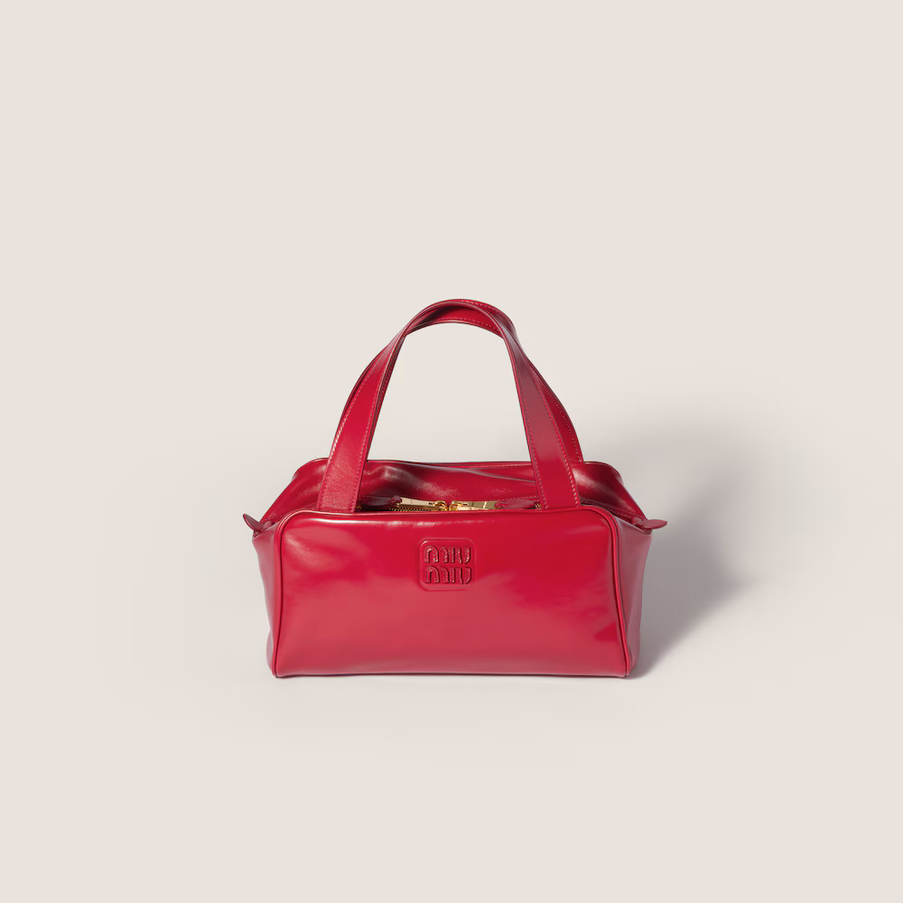 Compact and versatile, this new interpretation of the tote bag features flat handles, an elegant logo on the front, and the subtle sheen of supple calfskin, embodying Miu Miu's refined experimental spirit.