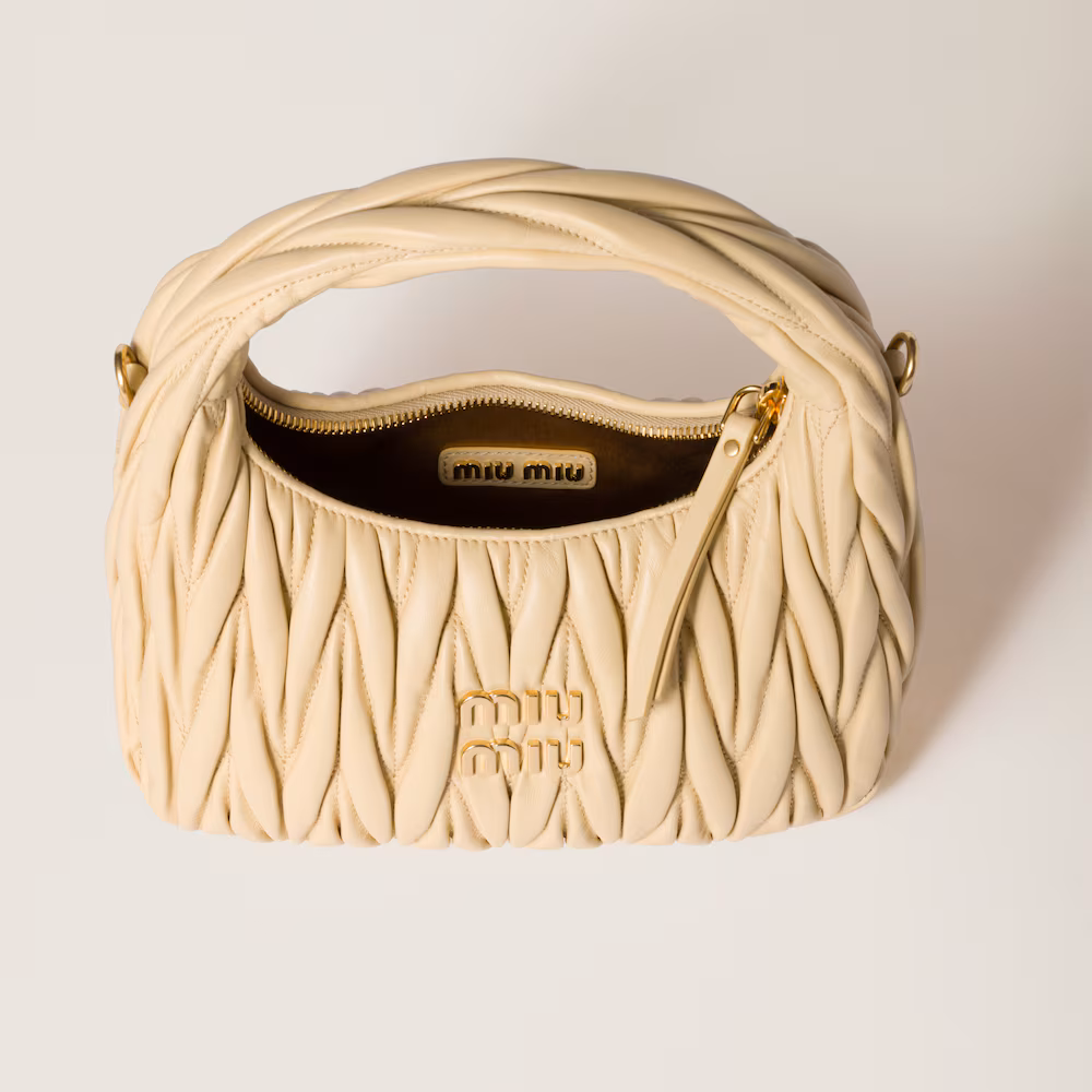 Wander handbags are constantly being updated and redesigned, becoming a classic accessory in the Miu Miu collection. This mini handbag is crafted from Matelassé soft lambskin, using exquisite craftsmanship to create a three-dimensional effect, exuding refined elegance. Presented in a crescent shape, it blends vintage charm with modern elegance, becoming a new synonym for contemporary femininity.