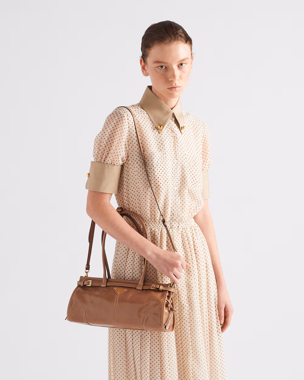 Nappa leather and nylon lining with a center zippered compartment and zippered patch pocket.