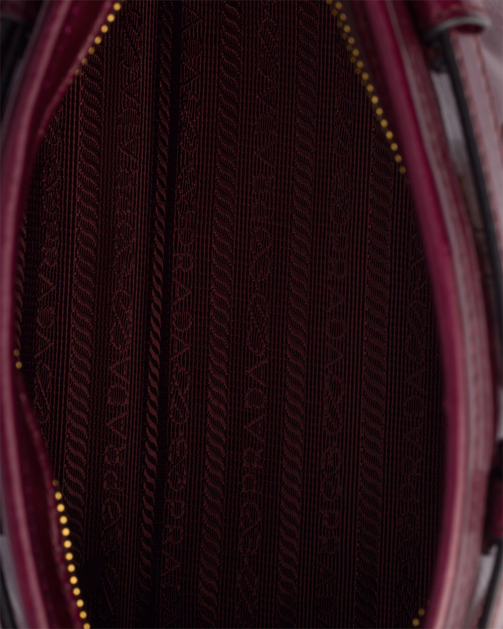 Practical yet refined, this shoulder bag is expertly crafted from supple leather with a distinctive lustrous finish, showcasing a sleek, modern design that epitomizes Prada's craftsmanship. The rectangular silhouette features an elegantly crafted shoulder strap with a nappa leather lining and a center zippered pocket. The detachable, adjustable shoulder strap features an enameled metal triangle logo, offering flexibility and versatility.